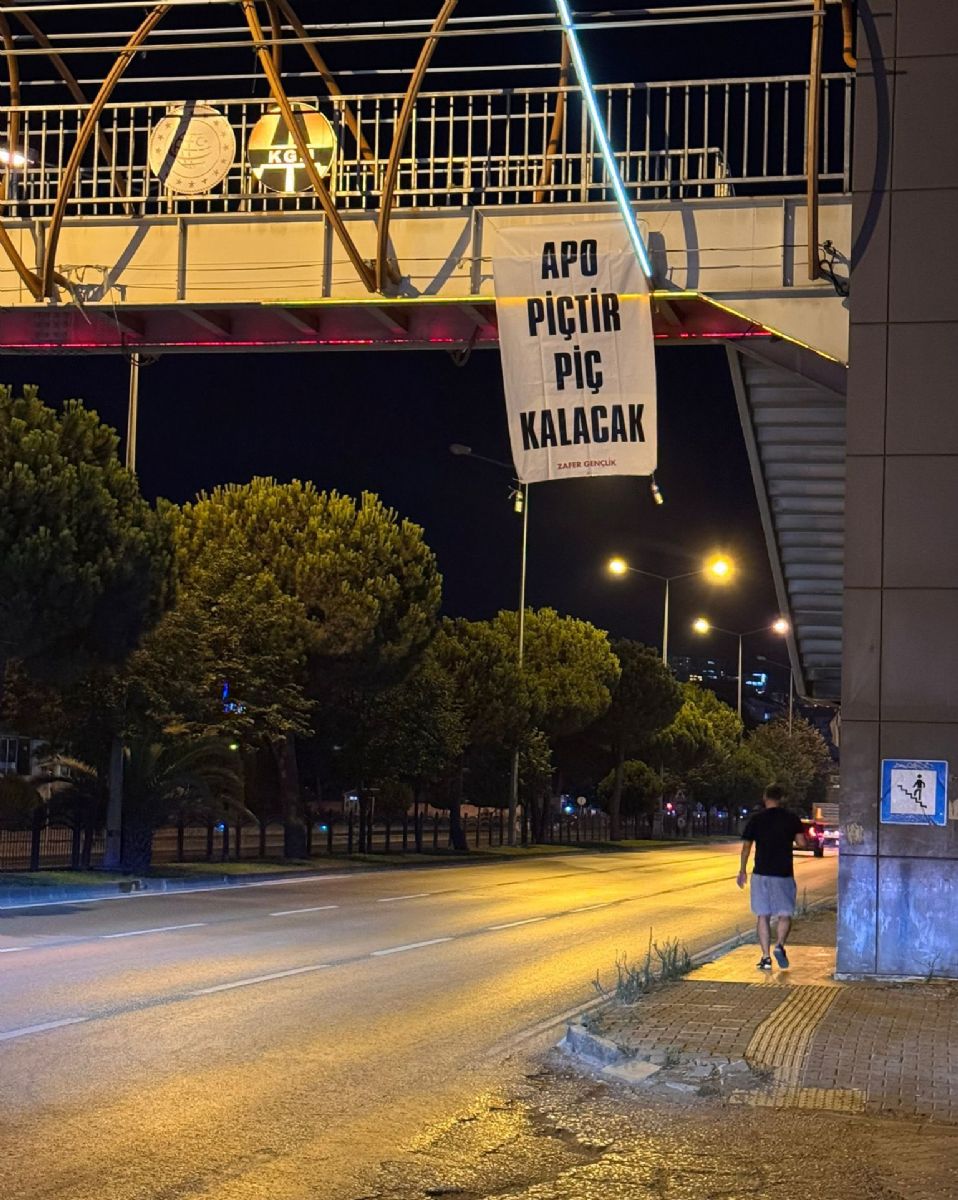 Şehrin farklı noktalarında, özellikle araç trafiğinin yoğun olduğu kavşaklara asıldığı görülen pankartlarda, "Öcalan Hangi Kapının İtidir", "Öcalan ile ilgili küfürlü ifadeler dikkat çekti.