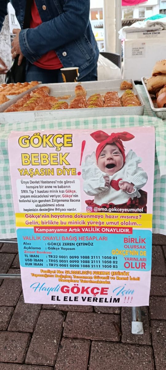 Ünye Devlet Hastanesi'nde görevli hemşire bir anne ile babanın, SMA Tip 1 hastası 5 aylık bebekleri Gökçe Zeren Çetinöz için zamanla yarışılıyor. Minik Gökçe'nin hayatını kurtaracak olan Zolgensma ilacına ulaşabilmesi için başlatılan bağış kampanyasına, Terme'de düzenlenen bir kermesle destek olundu.
