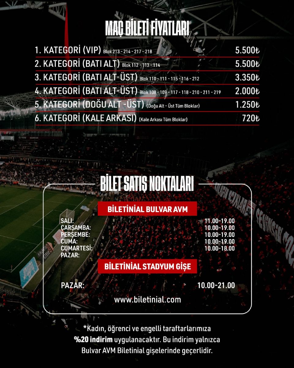 Bulvar AVM Biletinial gişesinden yapılan bilet alımlarında, kadın, öğrenci ve engelli taraftarlar için tüm tribünlerde geçerli %20 indirim uygulanacak. Bu indirimden yararlanmak için gişe satışları tercih edilmelidir.