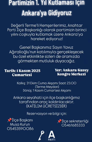 Anahtar Parti Terme İlçe Başkanlığı, hemşehrilerini bu önemli etkinliğe taşımak için bir seyahat organizasyonu düzenliyor. 31 Ekim Cuma akşamı saat 23.00'te Terme Meydanı'ndan kalkacak ücretsiz araçlarla Ankara'ya gidilecek. Kutlamaların ardından aynı gün akşam Terme'ye dönüş yapılacak. Katılımın tamamen ücretsiz olduğu etkinlik için rezervasyon yaptırılması gerekiyor.