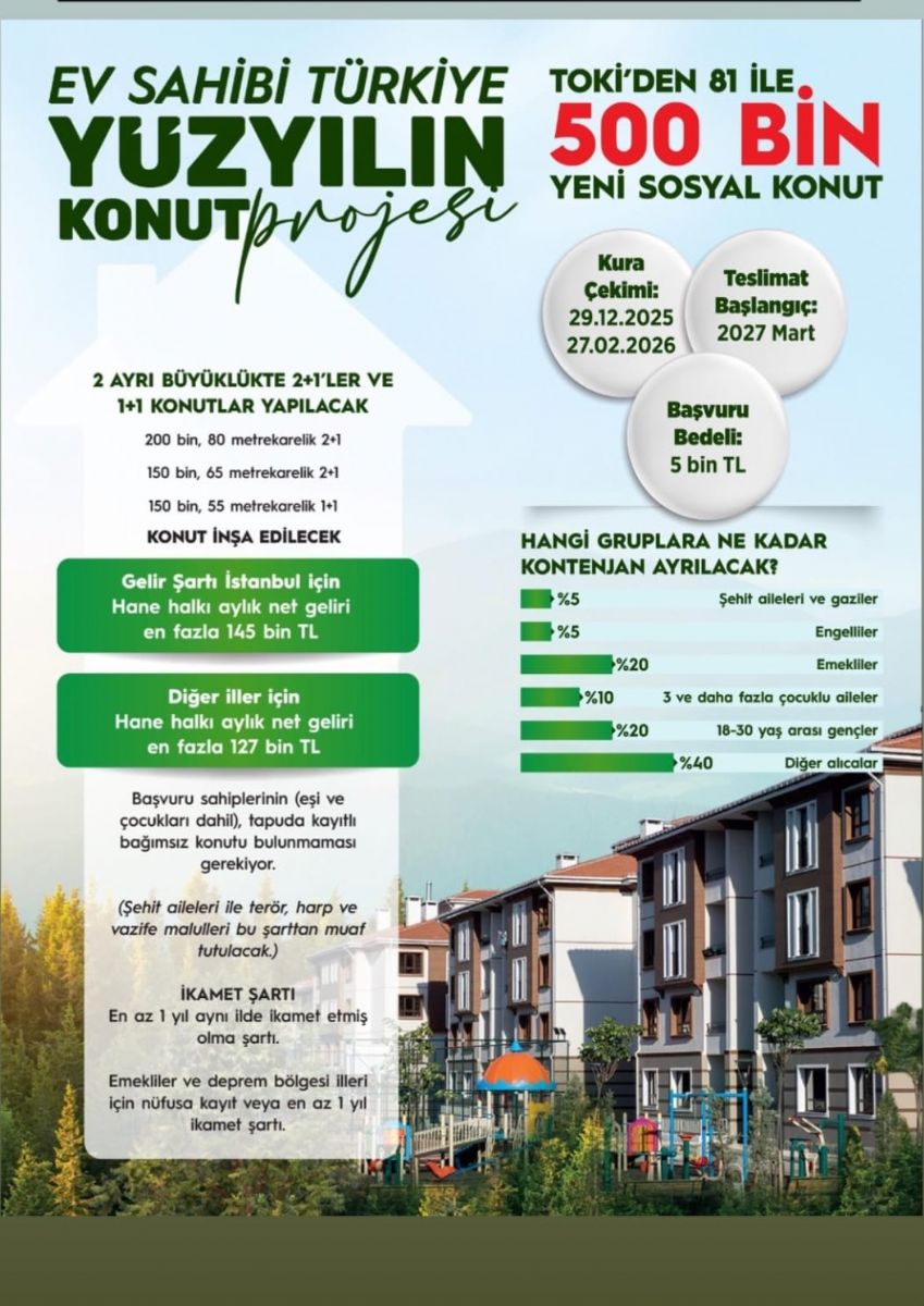 Kura ve Teslimat: Kura çekimleri Aralık 2025 ve Şubat 2026'da yapılacak. İlk teslimatlar ise Mart 2027'de başlayacak.