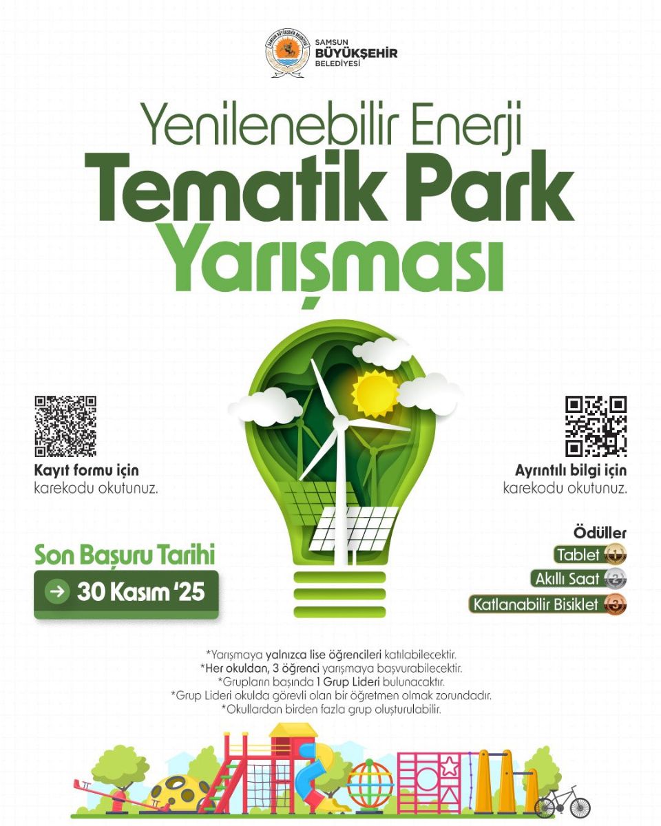 Samsun Büyükşehir Belediyesi, gençlerin çevre bilinci ve sürdürülebilir enerji konularındaki farkındalığını artırmak amacıyla “Yenilenebilir Enerji Tematik Park Yarışması” başlattı. Şehirdeki parklara yenilikçi dokunuşlar kazandırmayı hedefleyen yarışma, lise öğrencilerinin enerji temalı projelerini destekliyor.