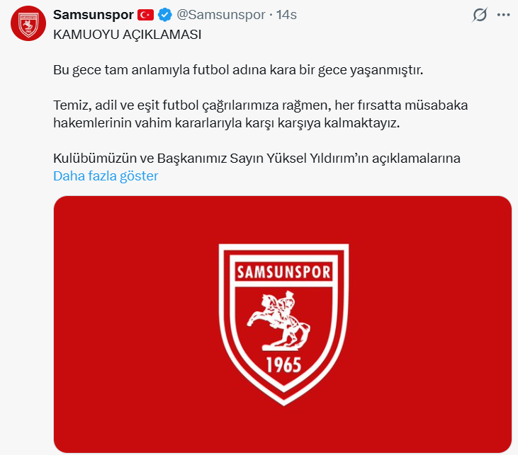 Maç bitiminin ardından Samsunspor resmî hesabından art arda paylaşımlar yaparak hakem kararlarını hedef aldı ve şu ifadeleri kullandı: