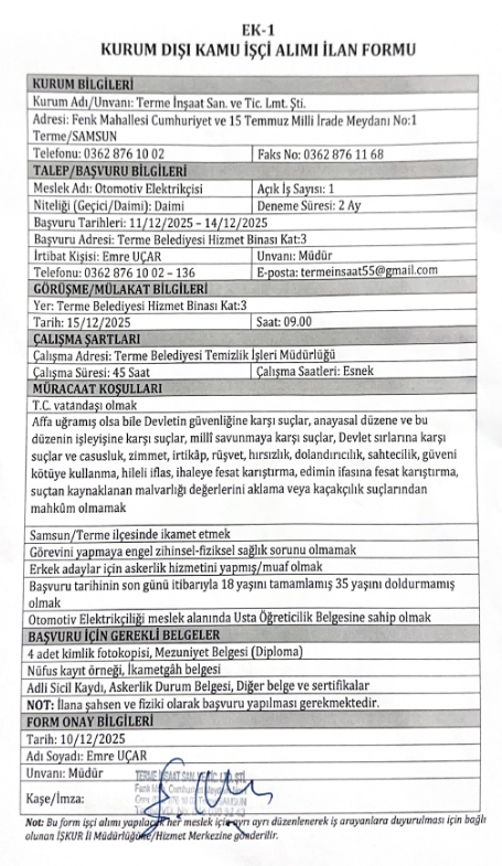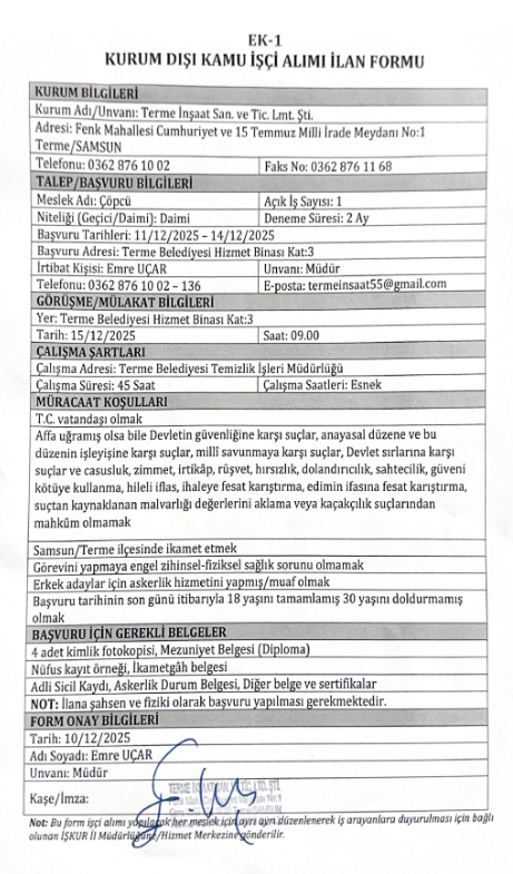 Terme İnşaat San. ve Tic. Ltd. Şti., Samsun’un Terme ilçesinde ihtiyaç duyulan kadrolar için 2 daimi işçi alımı yapacağını duyurdu. Çöpçü ve Otomotiv Elektrikçisi pozisyonlarında yapılacak alımlar için başvurular 11 – 14 Aralık 2025 tarihleri arasında kabul edilecek.