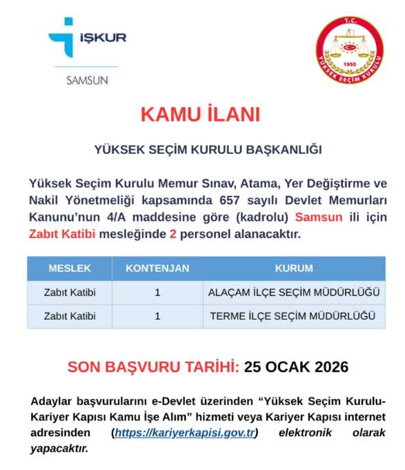Samsun’da kamu personeli olma hayali kuran adaylar için beklenen fırsat geldi. Yüksek Seçim Kurulu Başkanlığı (YSK), 657 sayılı Devlet Memurları Kanunu’nun 4/A maddesine göre istihdam edilmek üzere Samsun ilinde kadrolu Zabıt Katibi alımı yapacağını duyurdu.
