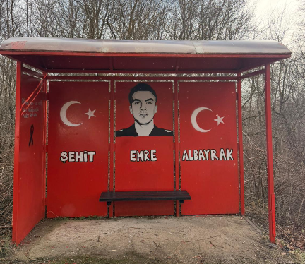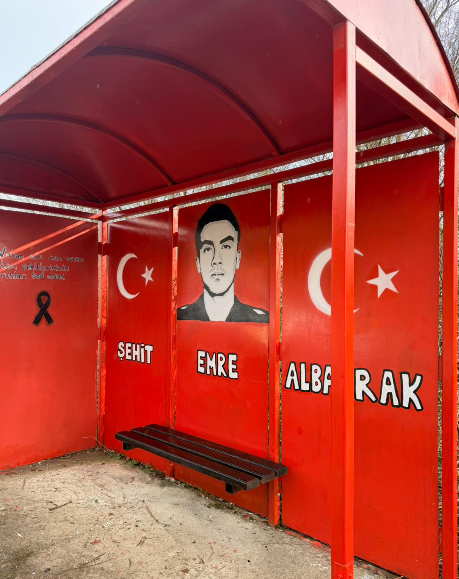 Durağın duvarlarına şehidin portresi çizilirken, Türk bayrağı ve “Şehit Emre Albayrak” yazılarıyla anlamlı bir görünüm kazandırıldı. Yapılan çalışma, hem görsel hem de duygusal yönüyle vatandaşlardan takdir topladı.