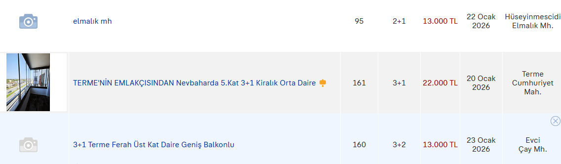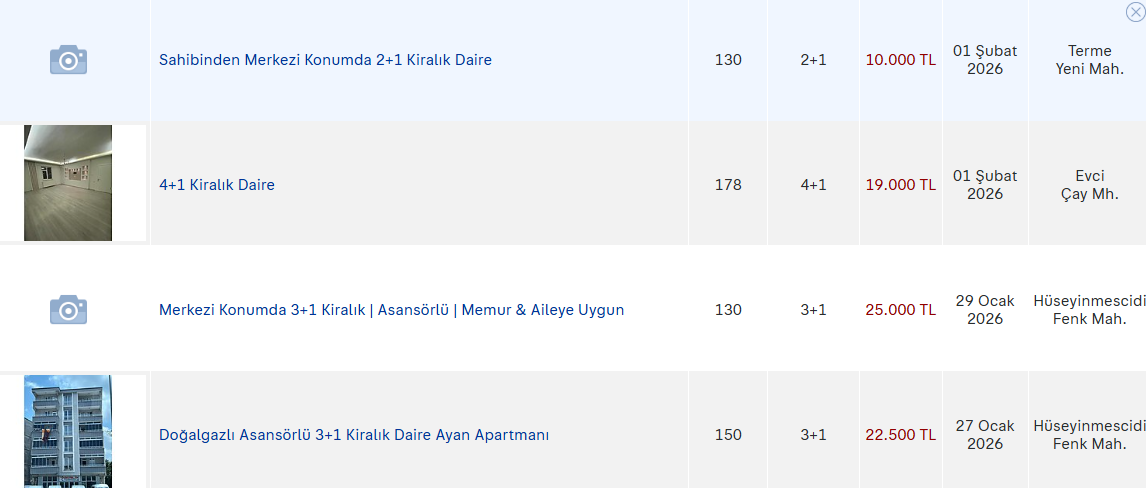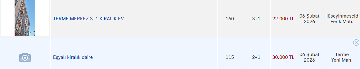 2026 Şubat ayı itibarıyla Terme’deki ilanlarda öne çıkan kira fiyatları şu şekilde: