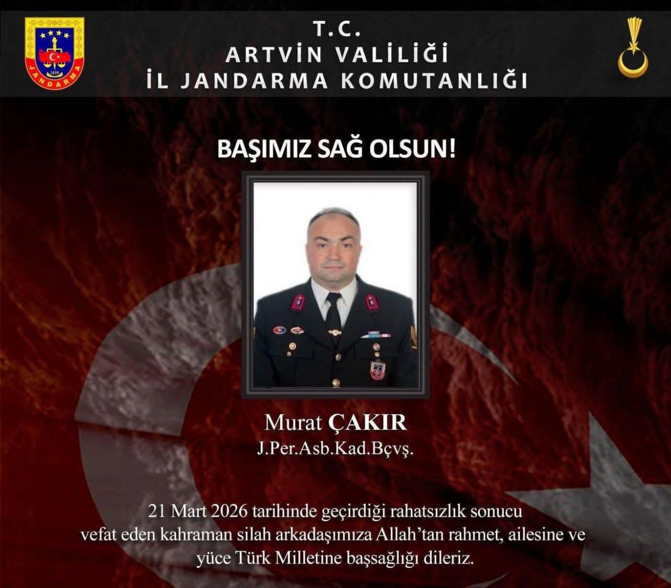 “Hopa İlçe Jandarma Komutanlığı’nda görevli Jandarma Astsubay Başçavuş Murat Çakır, 21.03.2026 günü geçirmiş olduğu kalp krizi sonucu hayatını kaybetmiştir. Allah’tan rahmet, kederli ailesine ve yakınlarına başsağlığı ve sabır diliyorum.”