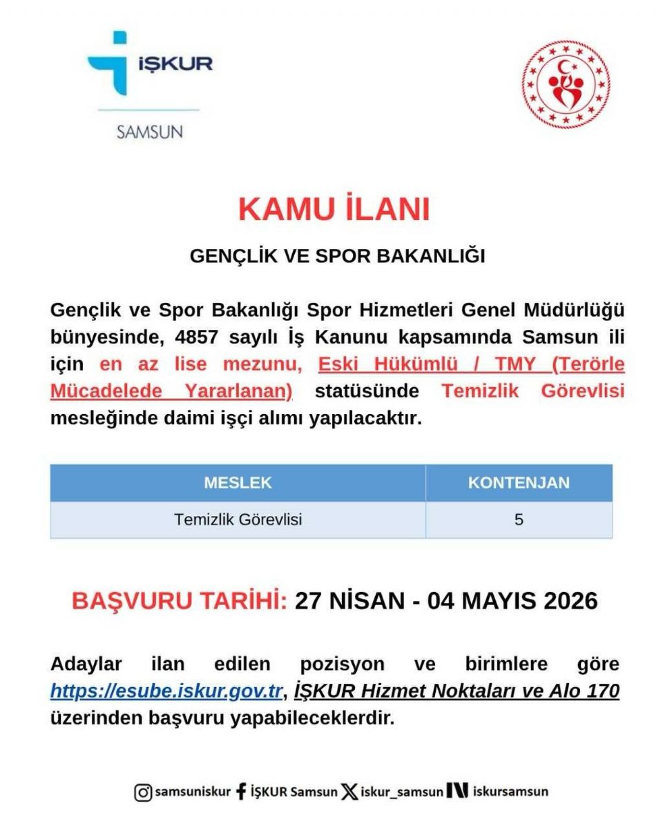 Samsun’da iş arayan vatandaşlar için önemli bir kamu ilanı yayımlandı. Gençlik ve Spor Bakanlığı Spor Hizmetleri Genel Müdürlüğü bünyesinde, 4857 sayılı İş Kanunu kapsamında Samsun ili için daimi işçi alımı yapılacağı duyuruldu.